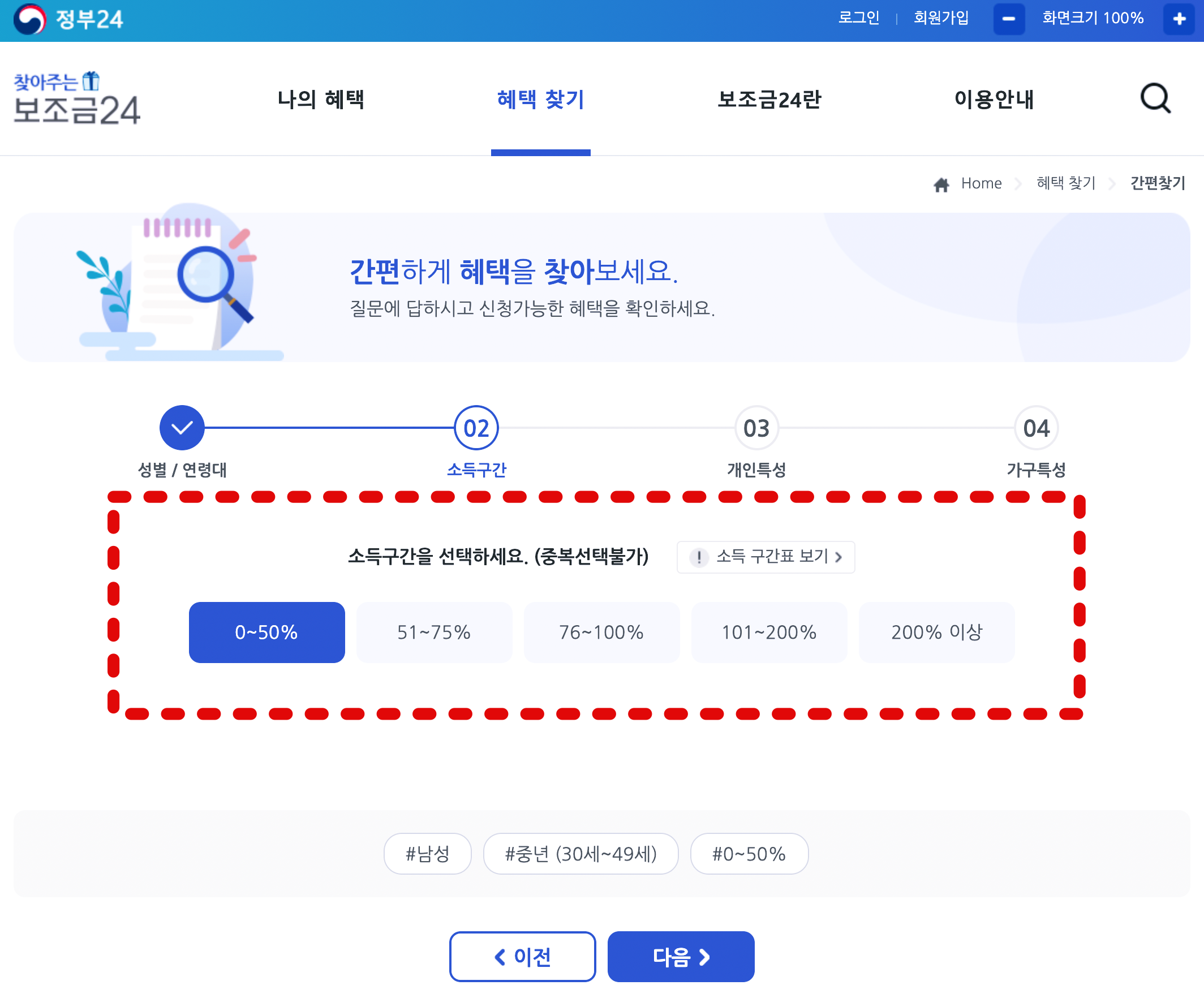 우선, 연령을 선택하고 소득구간을 선택해야 합니다. 여기서는 최대한 받을 수 있는 지원금 목록을 살펴보기 위해 최저소득을 선택하겠습니다.